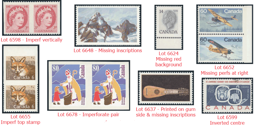 of these issues. During this period, glitches in the printing process resulted in hundreds of stamps with misprints, misperforations, and missing or misplaced inscriptions and colours. This has created a fascinating and challenging area of collecting. Our sales always feature an excellent selection of Canadian errors and varieties.