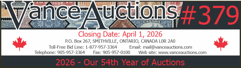 The past few months have been very busy here at Vance Auctions. Our experienced lotters have processed many new collections and estates that have come in. The result is Sale #379, one of our largest sales in years with over 8,000 lots. Thousands of these lots are illustrated in the printed catalogue and at our website.